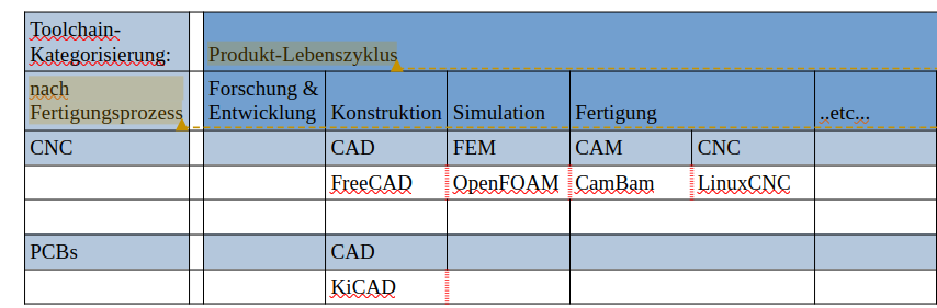 very interesting! I had some thoughts to organize tools / toolchains by 1) design process steps (very general) and then 2) a specific process of production. Here is a screenshot of my first thoughts (some words in German, sorry):
